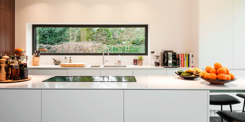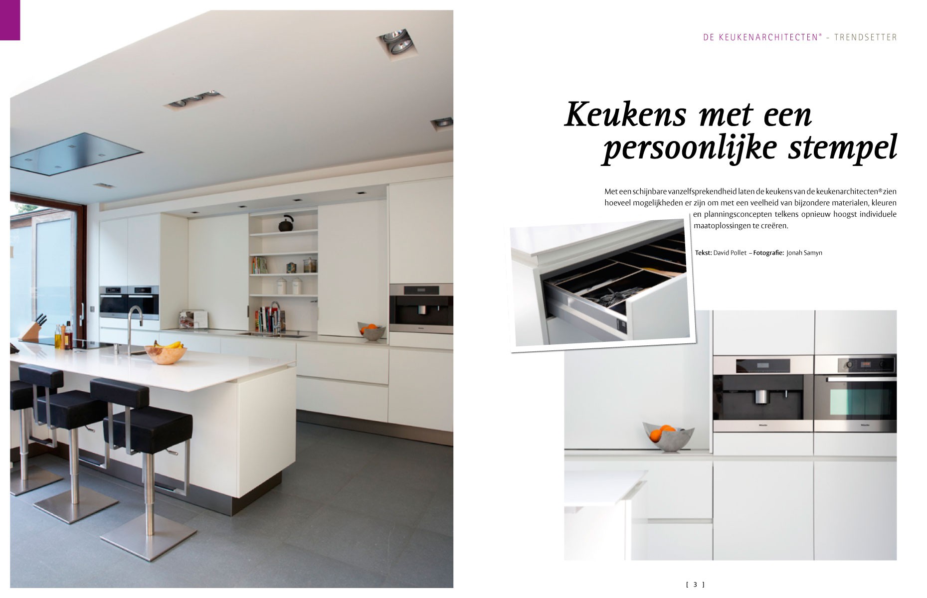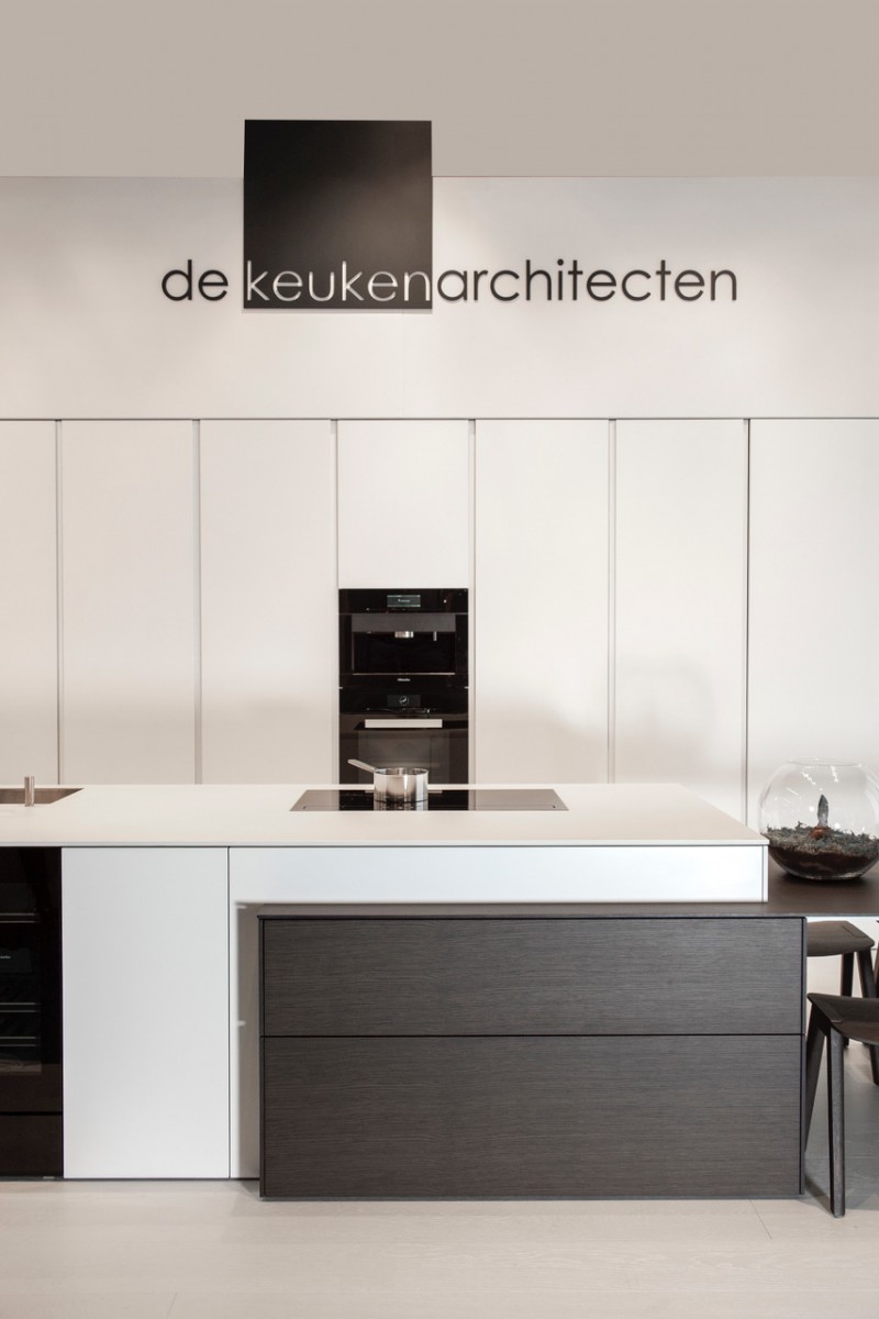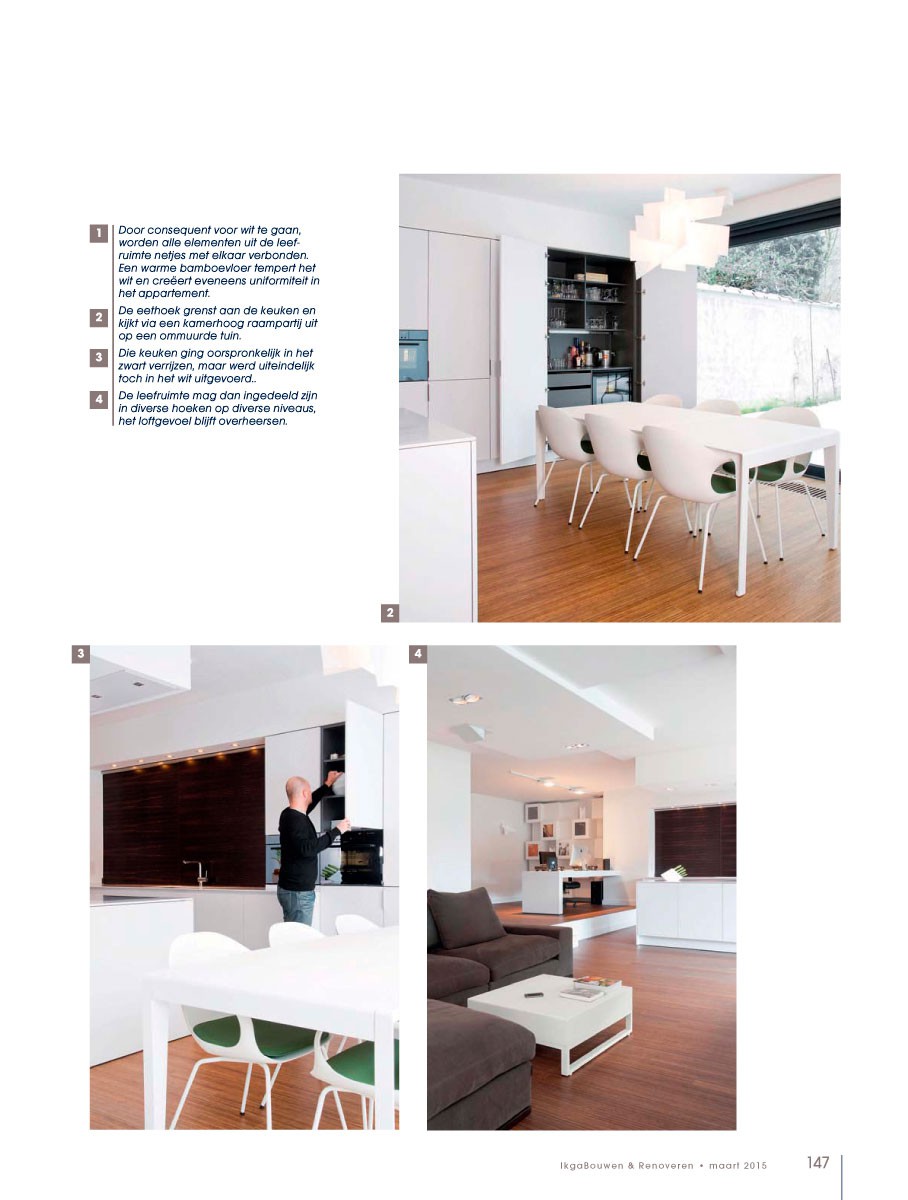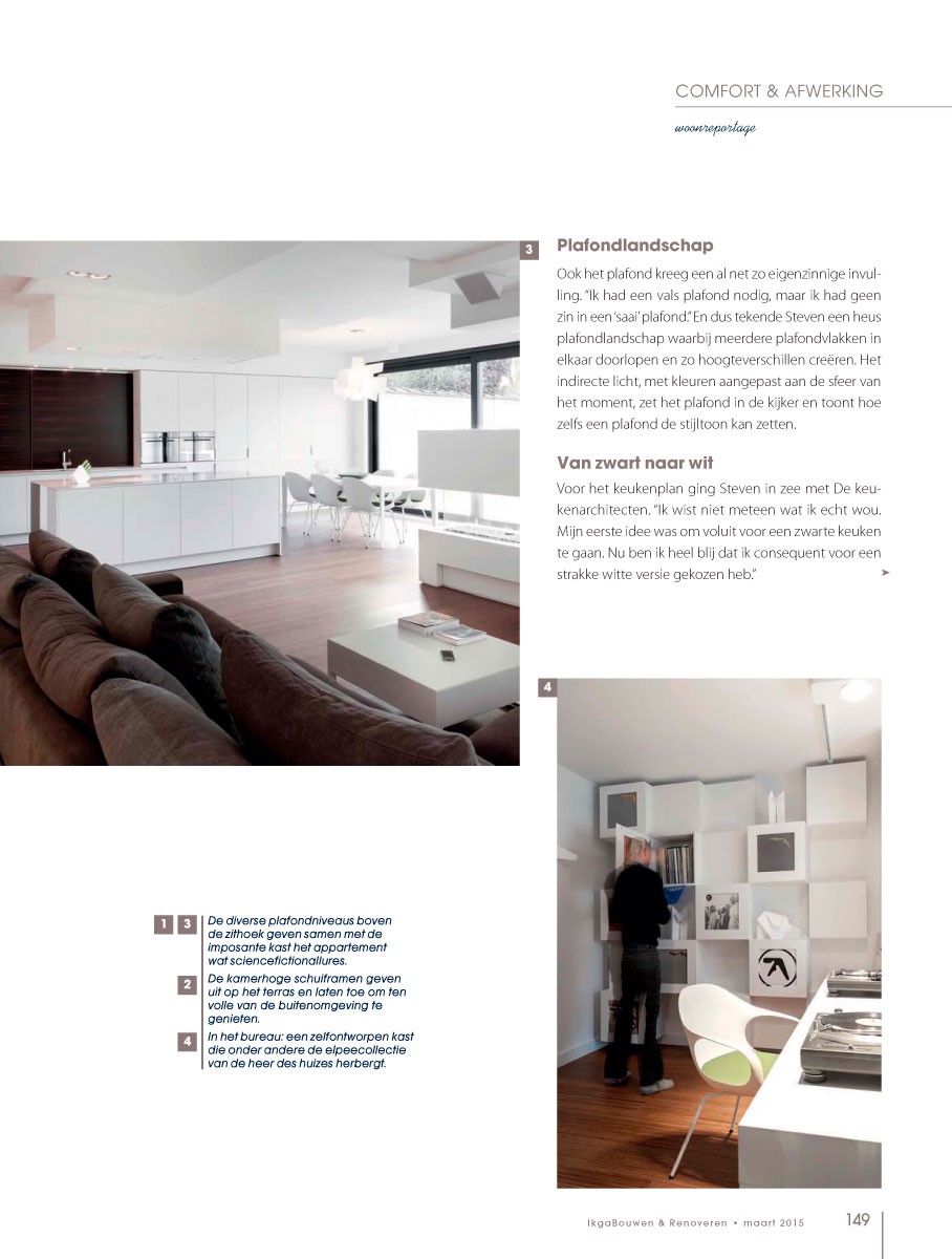 Voor het keukenplan en de uitvoering ervan ging de bouwheer in zee met de keukenarchitecten : “ik ben heel blij dat ik consequent voor het strakke gekozen heb.” In samenspraak werd het wit gecombineerd met een streepje fineer.