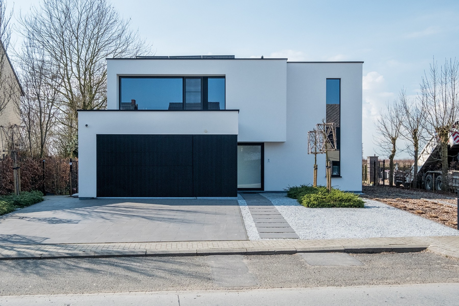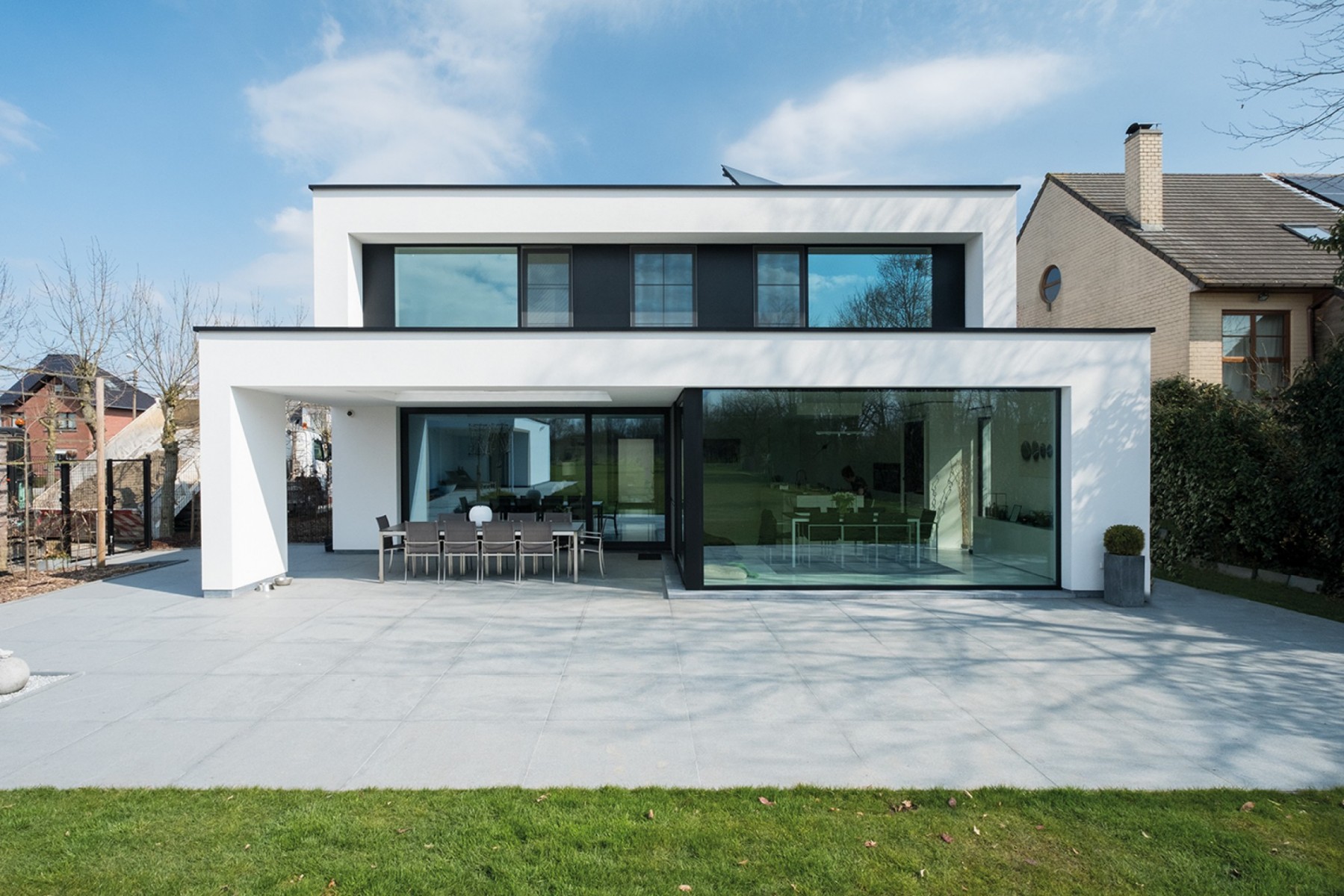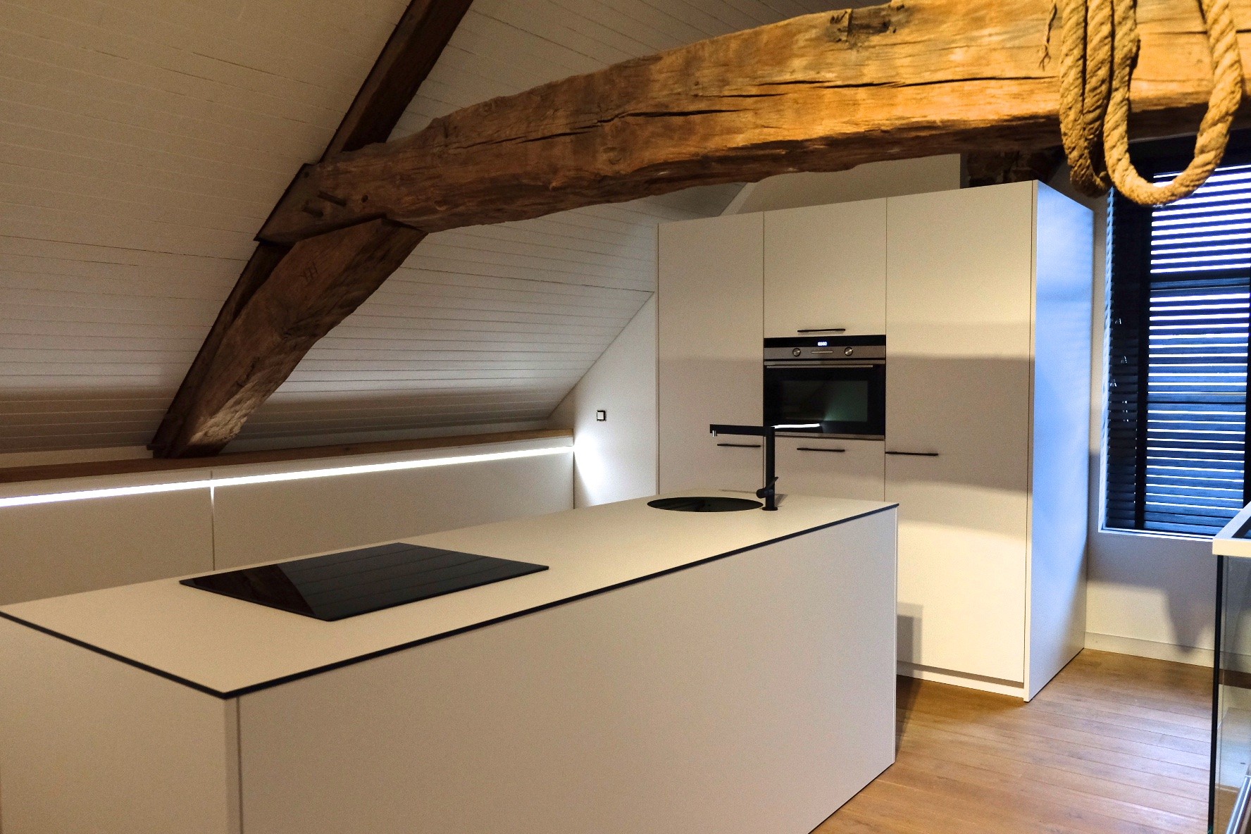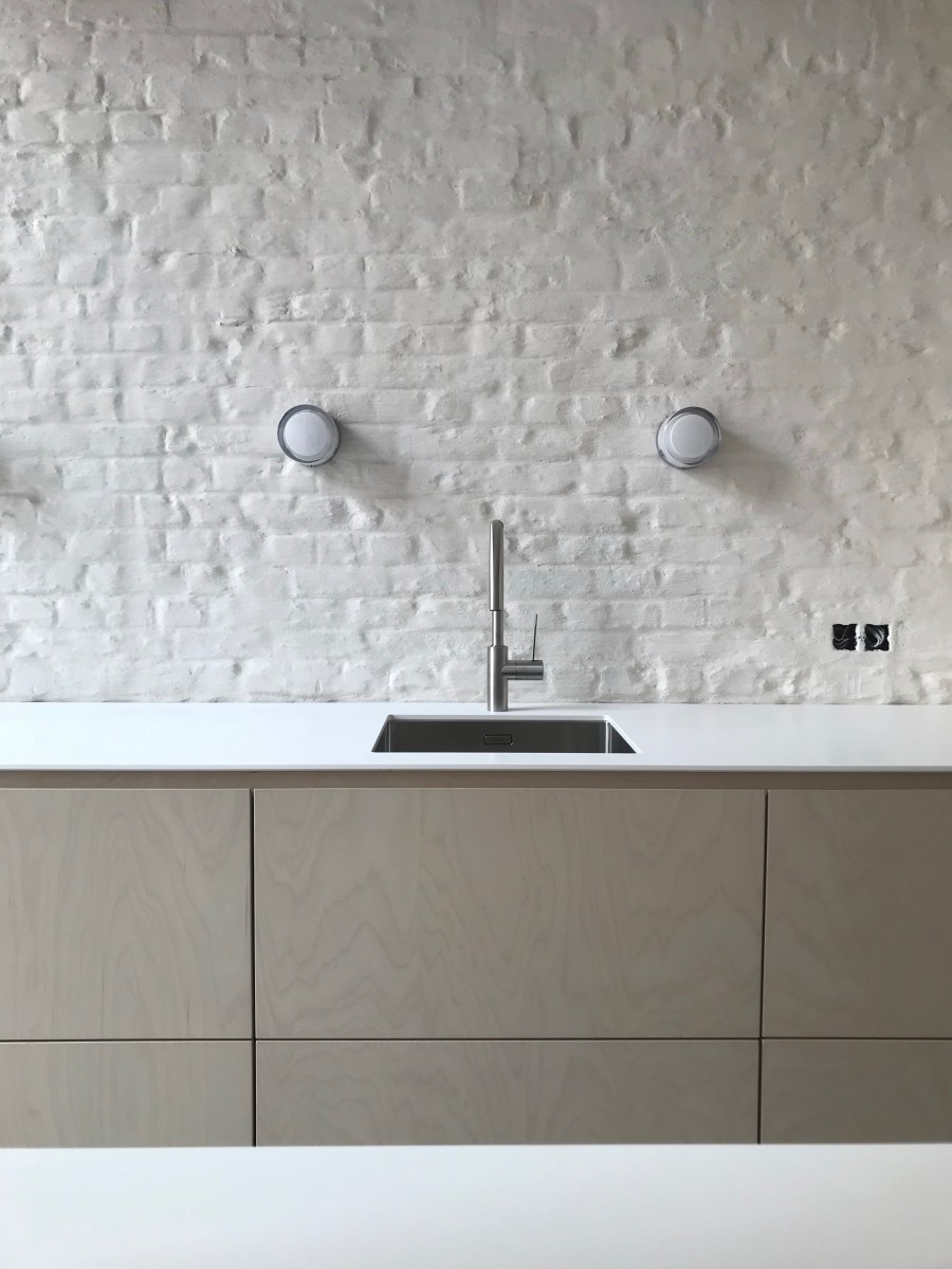 Voor het keukenplan en de uitvoering ervan ging de bouwheer in zee met de keukenarchitecten : “ik ben heel blij dat ik consequent voor het strakke gekozen heb.” In samenspraak werd het wit gecombineerd met een streepje fineer.