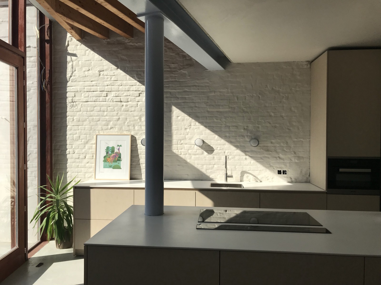 combinatie tussen berkfineer, werkbladen in solid surface wit (LG HiMacs) en stalen gelakte pootjes.