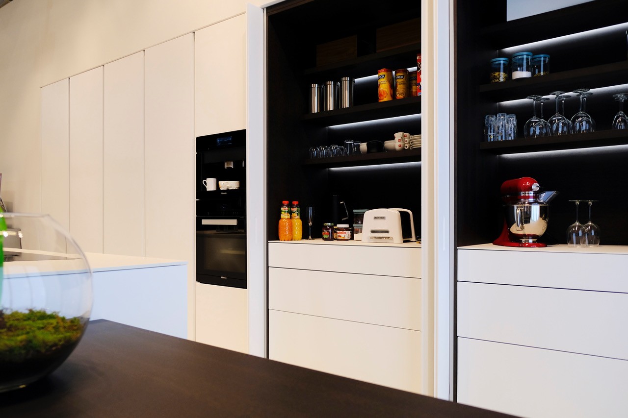 Highlights : extra werkzone + kantoorruimte binnen de keukenopstelling (achter inschuivende deuren).