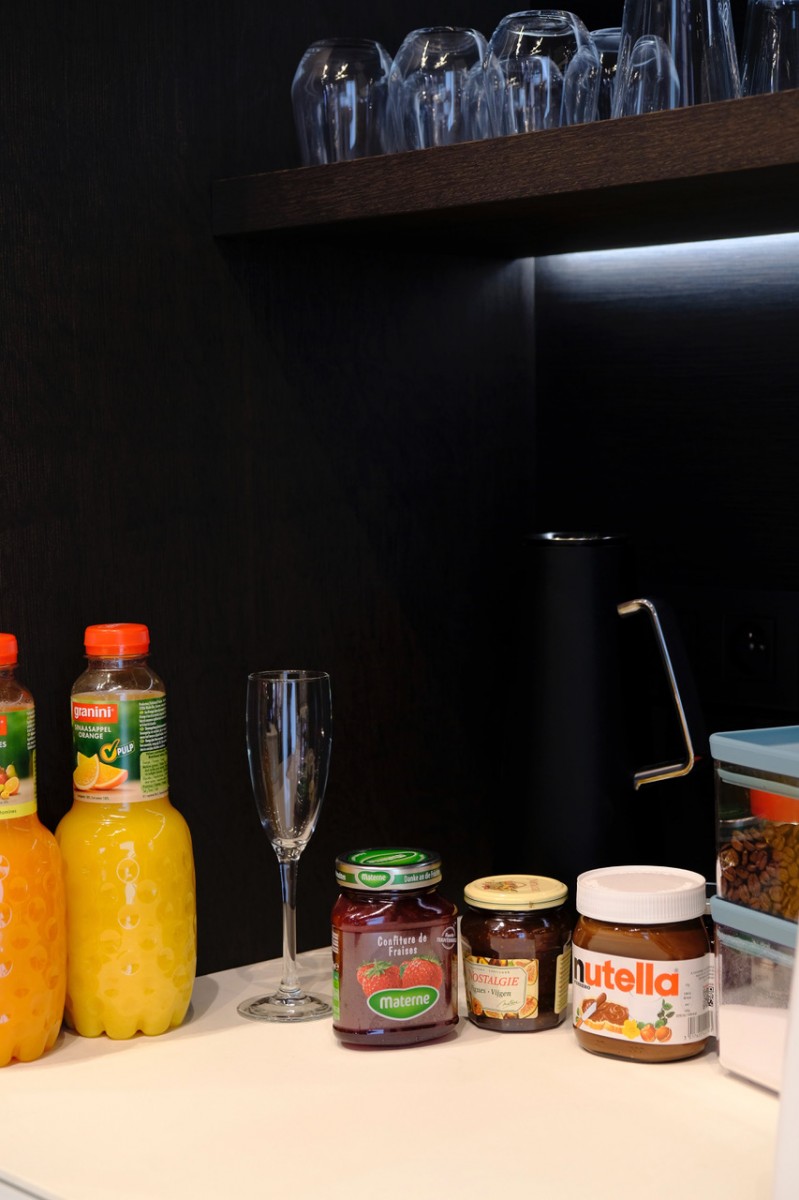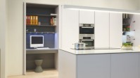 Door het toepassen van een dubbele extra werkzone worden effectief twee afsluitbare zones gecreëerd in deze zone: 1: de ontbijtzone met ruimte voor espressotoestel, fruitpers e.d. (uiteraard met de nodige ruimte voor al de ontbijtspullen) en anderzijds 2: de werkzone - ruimte voor een keukenrobot (en al z’n accessoires), zo staan ook deze toestellen onmiddellijk klaar voor gebruik.