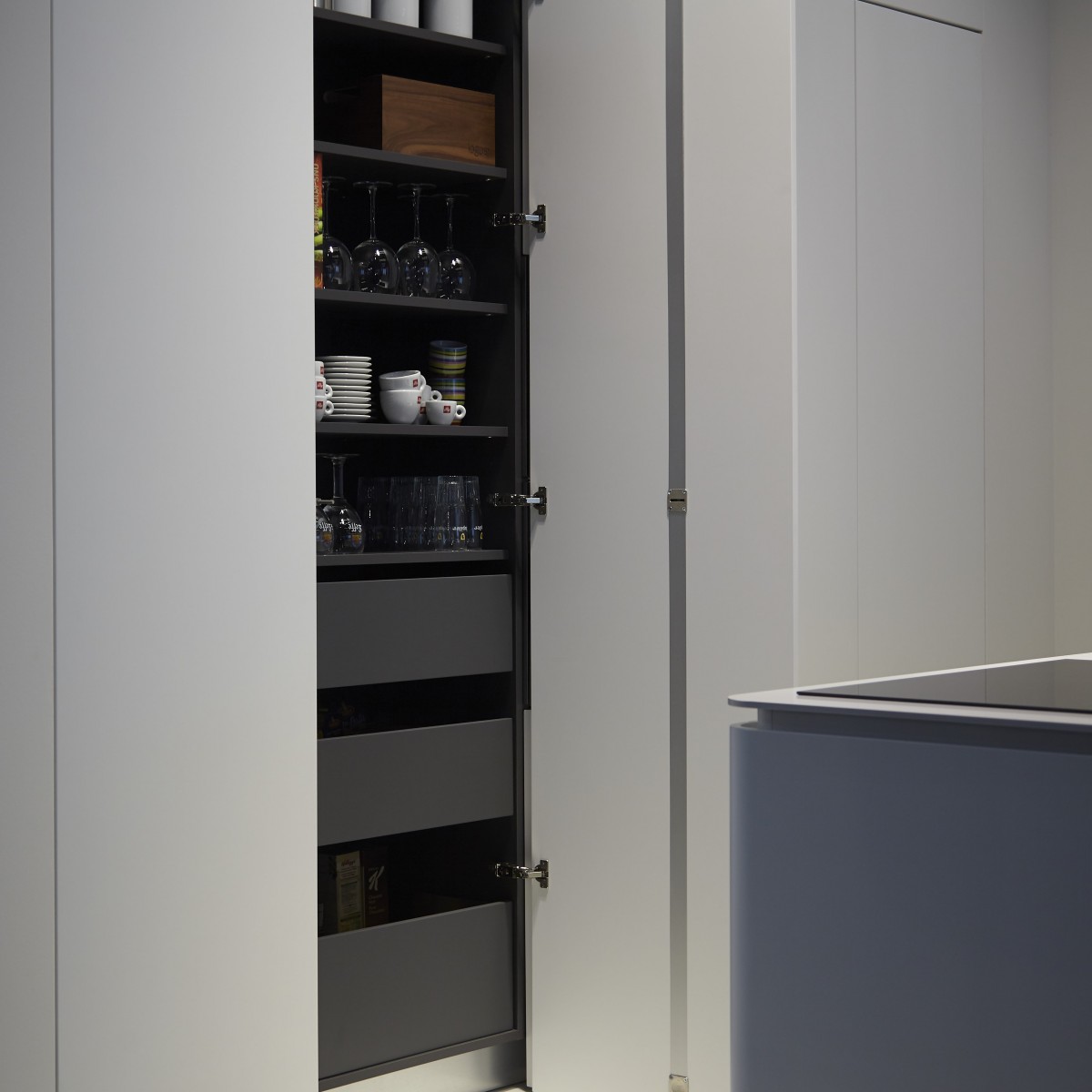 Samen met eggersmann presenteren we een strakke afwerking : toestellen worden opgesteld achter de frontpanelen, zodanig dat enkel nog een kastenwand zichtbaar blijft.