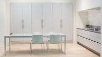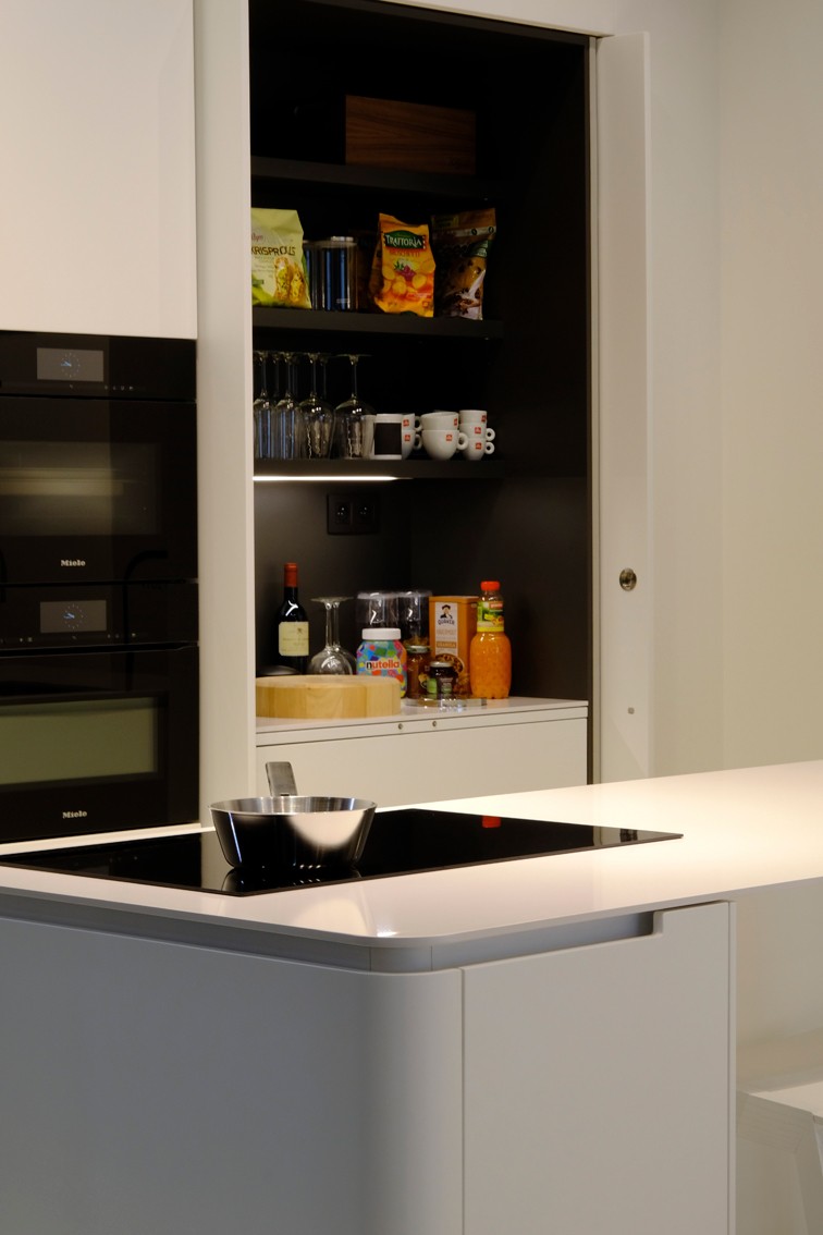 Naast een indrukwekkend eiland en een extreem handige kolomkastenwand (met twee afsluitbare extra werkzones) wordt de doorgang gemaakt naar een achterliggende berging waarin zowel wasmachine als droogkast een functionele presentatie krijgen: op werkhoogte en eveneens weggewerkt in een kastenwand. Het geheel is uitgewerkt in de gloednieuw ontwikkelde serie S5: een combinatie van greeplijsten met greeploze bediening.