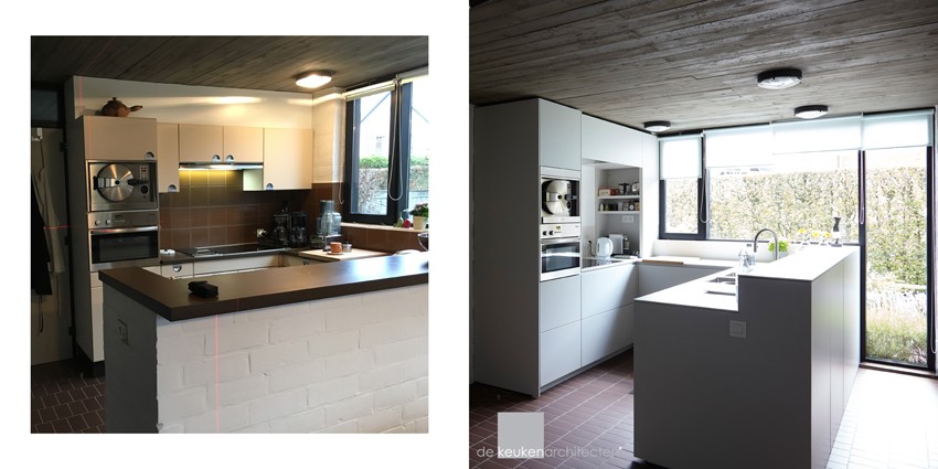 De keuken wordt niet alleen een stukje strakker, maar ook heel wat ruimer : Waar vroeger een muurtje zorgde voor de afscheiding met de rest van de keukenruimte is nu extra kastruimte voorzien (met frontpanelen, reikend tot net boven de vloerpas). Zowel kook- als spoelzones werden ruim voorzien van (hoge) laden, wat weeral een surplus bood t.o.v. de draaideurkasten van weleer. -